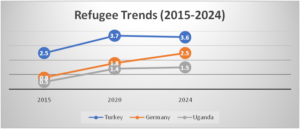 From 2015 to 2024, the global refugee crisis has grown more complex and urgent due to ongoing wars, political turmoil, and humanitarian disasters. The situations in Turkey, Germany, and Uganda illustrate how different countries manage large-scale displacement depending on their location, capacity, and policies. Turkey, sharing a border with Syria, has become the world’s largest refugee-hosting nation. Its refugee population increased significantly from 2.5 million in 2015 to 3.7 million in 2020 as millions fled the Syrian civil war. Although there was a slight reduction by 2024, Turkey continues to bear a heavy responsibility because of its proximity to conflict-affected regions. Germany emerged as a key destination for refugees in Europe, especially during the 2015 migration wave and the 2022 Ukraine crisis. Its refugee numbers rose from 0.8 million to 2.5 million by 2024, reflecting its organized asylum system and commitment to protecting displaced persons. Uganda, despite limited economic resources, has displayed strong humanitarian commitment by welcoming refugees from South Sudan and the Democratic Republic of Congo, with its refugee population rising from 0.5 million to 1.5 million over the same period.